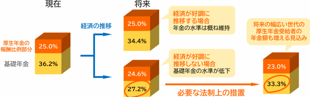 今後の社会経済情勢を見極めたうえで、次期財政検証(2029年予定)を経て基礎年金の給付水準の低下が見込まれる場合には、その水準の向上を図るための措置が講じられることになりました。