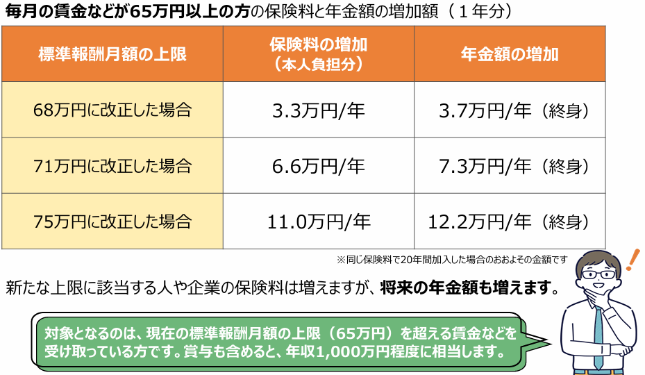 今回の改正により、標準報酬月額の上限が、現行の65万円から75万円まで段階的に引き上げられることになりました(※)。これにより毎月65万円を超える賃金などを受け取っている人が、収入に応じた保険料を負担することで、将来年金を受け取るときに現役時代の賃金に見合った金額を受給できるようになります。
