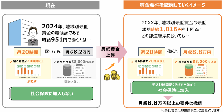 撤廃の時期については、全国の最低賃金の上昇状況を踏まえて検討されています。すべての都道府県において地域別最低賃金が時給1,016円を超えると、週20時間勤務でも月収8.8万円以上となり、すべての都道府県で現行の賃金要件を満たす水準に達するためです。